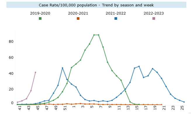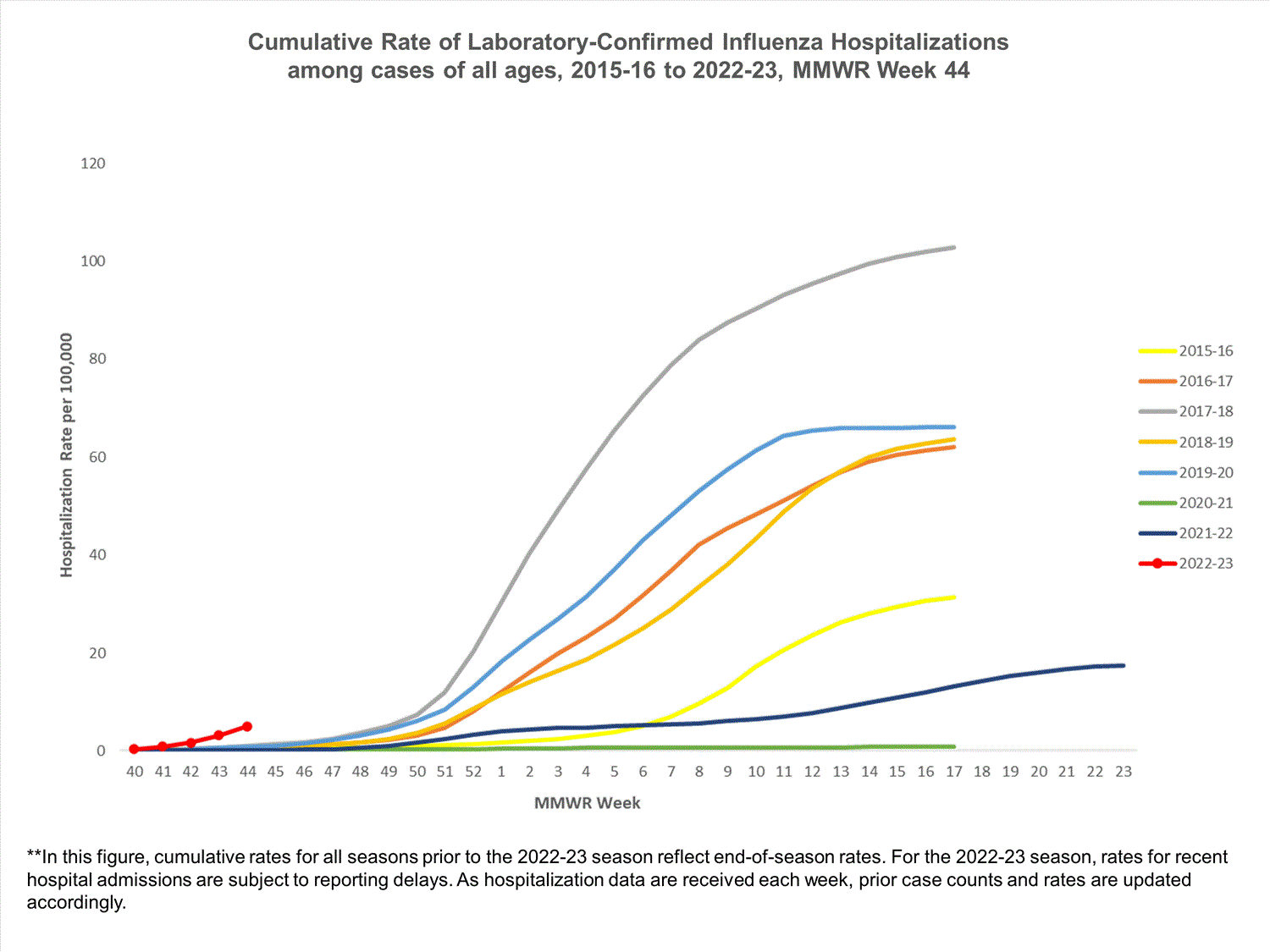What is unusual about this season’s data is things are ramping up earlier than expected. The hospitalizations are increasing sooner than in prior seasons, but the hospitalization rate is not drastically greater than prior seasons.