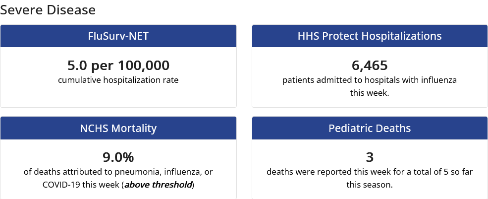 In addition to the lingering credibility issues the CDC has after its shameful handling of the COVID-19 “pandemic”, FluView has a structural limitation: these top level charts are nationwide data. Given the geographic size of the US, the nationwide data is problematic for assessing the severity of this year’s flu; state and local data are far more relevant for understanding the severity of seasonal flu in your area.