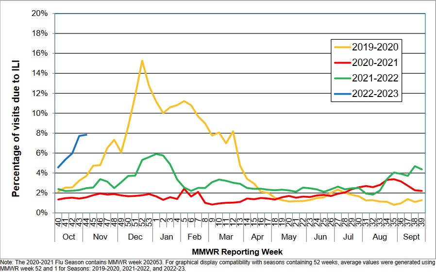 Ugh, my colleagues are insistent the flu is bad because people are no longer wearing masks this fall. Meanwhile, I live in a very red state, and masks haven't been very common for over a year. Why is flu so early?