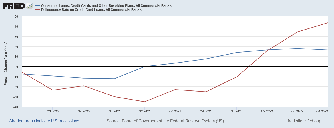 Moreover, relative growth in credit card debt exceeded relative growth in consumer spending throughout 2022.