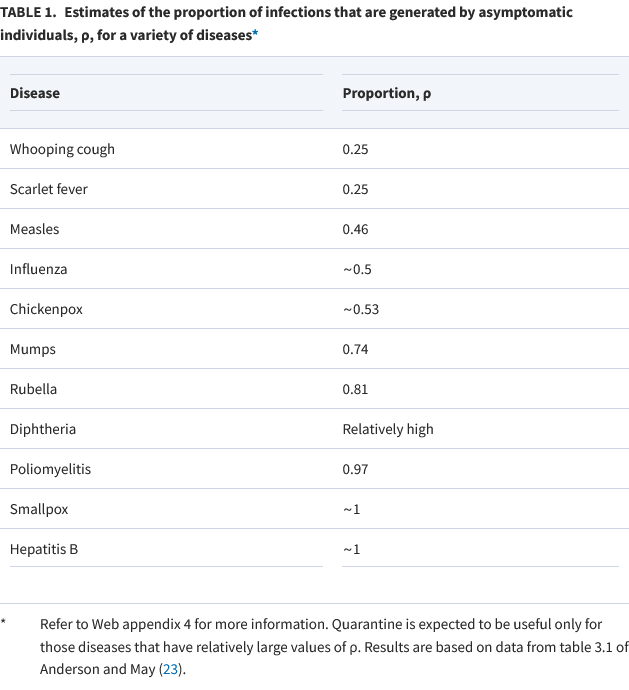 (Side note: the low proportion of asymptomatic transmission for influenza and presumably for COVID-19 by the same logic makes quarantine largely ineffective, and the experience of the past two years bears this out).