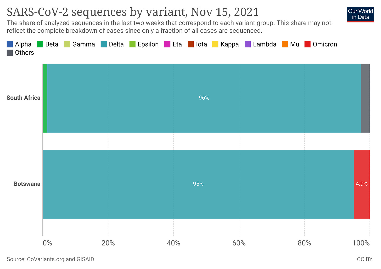 As of November 15, Botswana's COVID cases were just under 5% Omicron, and South Africa had yet to report any appreciable numbers of cases.
