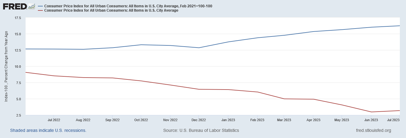 The top (red) line is simply the Consumer Price Index, re-indexed to February 2021, with the base value of 100 subtracted. The bottom (blue) line is the Year on Year percent change in that same Consumer Price Index. When we gather these same two presentations of the Consumer Price Index on a single graph on FRED, we get the same display.
