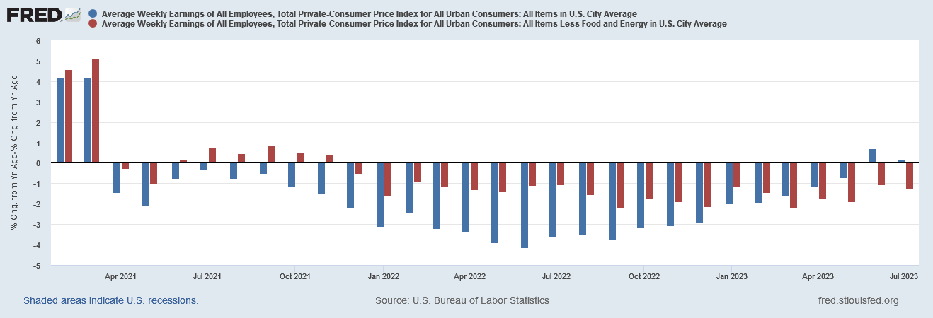 Real weekly wages measured year-over-year have dropped for 26 of the 30 months of the Biden presidency. On a positive note, it broke a 26-month negative run in June.