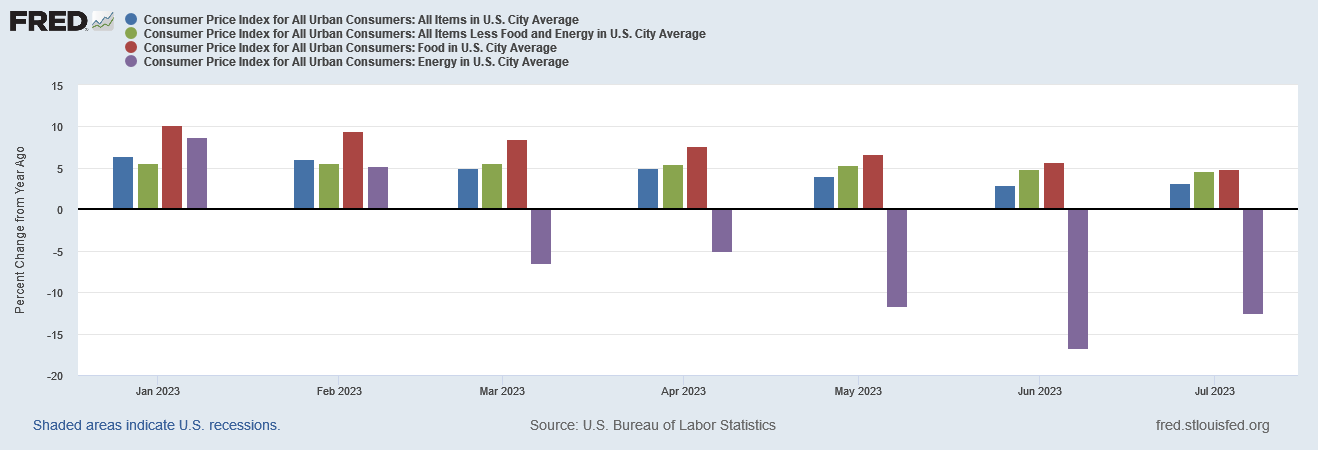 Taking this paragraph at face value, we are left with the unmistakable implication that energy prices are rising and not falling. The reality, however, is that energy prices have risen since February 2021, but have also fallen since June of 2022. There is no “difference” here, as both assertions are true: the Consumer Price Index does show energy prices having increased 33.5% since February 2021 and show energy prices having declined year on year by 12.5% in July of 2023. There is absolutely no conflict between these two assertions.