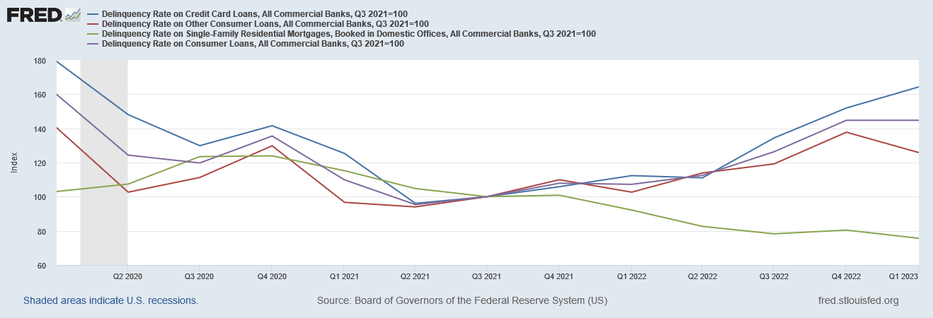 This is quite probably an artifact of consumers using their initial stimulus checks to pay off their credit cards in 2020 and 2021. If we index to the start of the third quarter in 2021, credit card debt is still the big delinquency gorilla in the room.