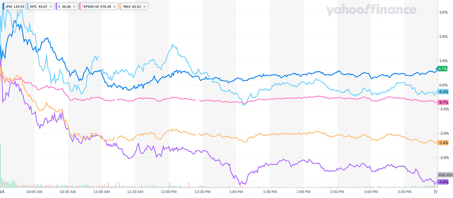 Wall Street apparently senses the same thing. Despite reporting stellar net income results for the second quarter, JPMorgan did not receive even an initial bump from their results. Wells Fargo actually saw its share price decline, and Citi took a substantial 4% hit.