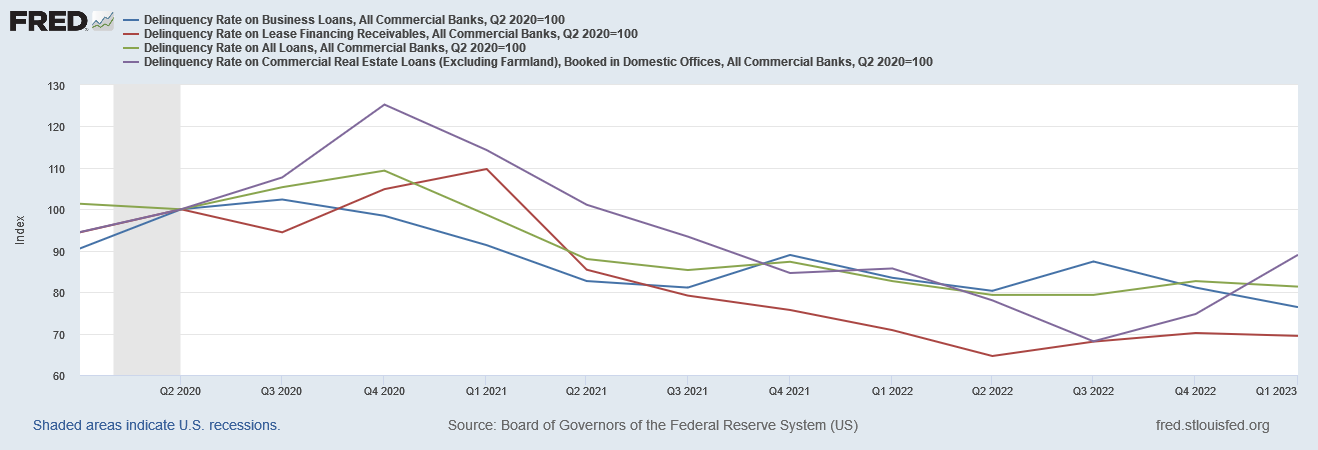 If we index the loan delinquencies to the end of the 2020 recession, we see that commercial real estate loans are turning toxic far more rapidly than most other forms of commercial loans.