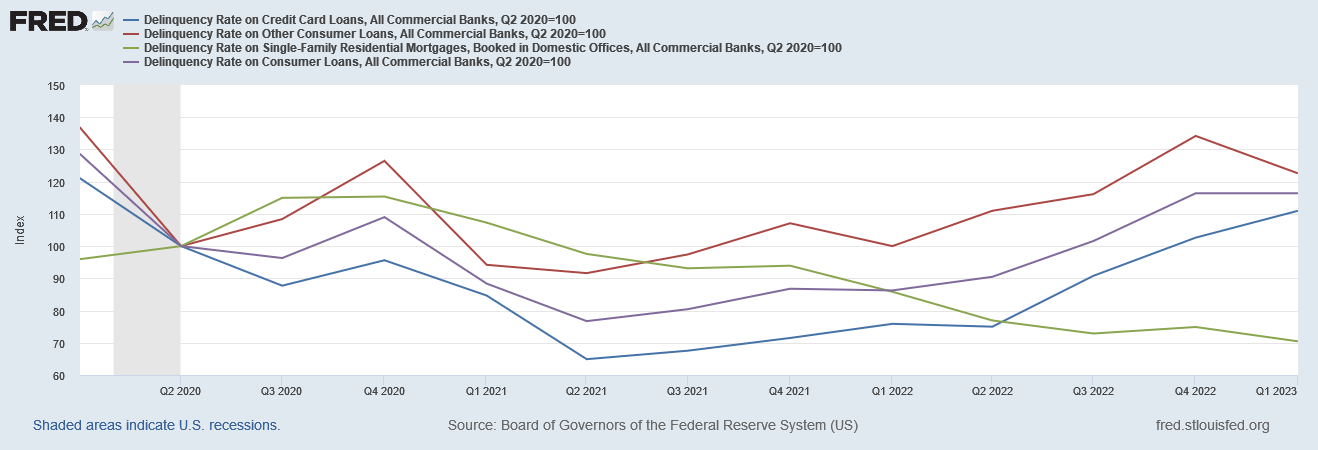 If we index consumer loan delinquencies to the end of the 2020 recession, we see that “other consumer loans” (usually car loans) have seen the most dramatic rise in recent quarters.