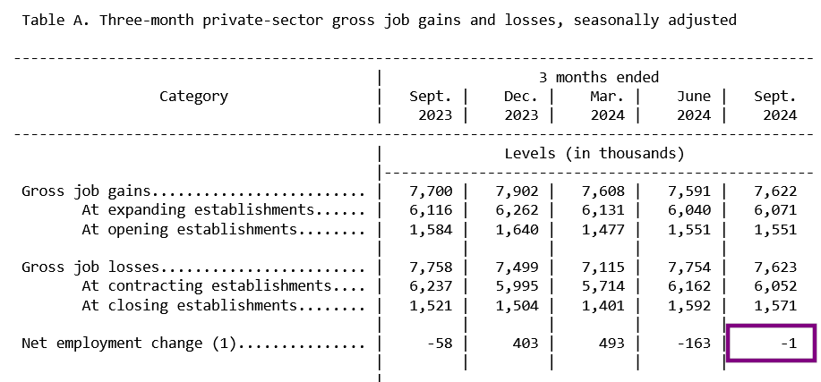 From June 2024 to September 2024, gross job losses from closing and contracting private-sector establishments were 7.6 million, a decrease of 131,000 jobs from the previous quarter, the U.S. Bureau of Labor Statistics reported today. Over this period, gross job gains from opening and expanding private-sector establishments were 7.6 million, an increase of 31,000 jobs from the previous quarter. (See tables A and 1.)