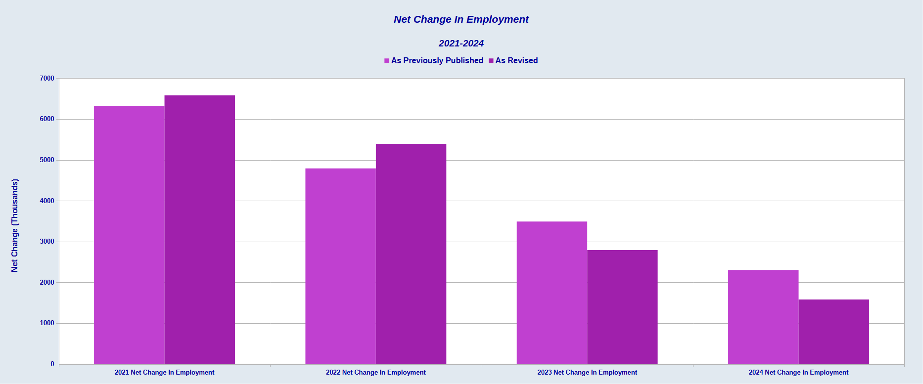 In accordance with annual practice, the establishment survey data released today have been benchmarked to reflect comprehensive counts of payroll jobs for March 2024. These counts are derived principally from the Quarterly Census of Employment and Wages (QCEW), which counts jobs covered by the Unemployment Insurance (UI) tax system. The benchmark process results in revisions to not seasonally adjusted data from April 2023 forward. Seasonally adjusted data from January 2020 forward are subject to revision. In addition, data for some series prior to 2020, both seasonally adjusted and unadjusted, incorporate other revisions.