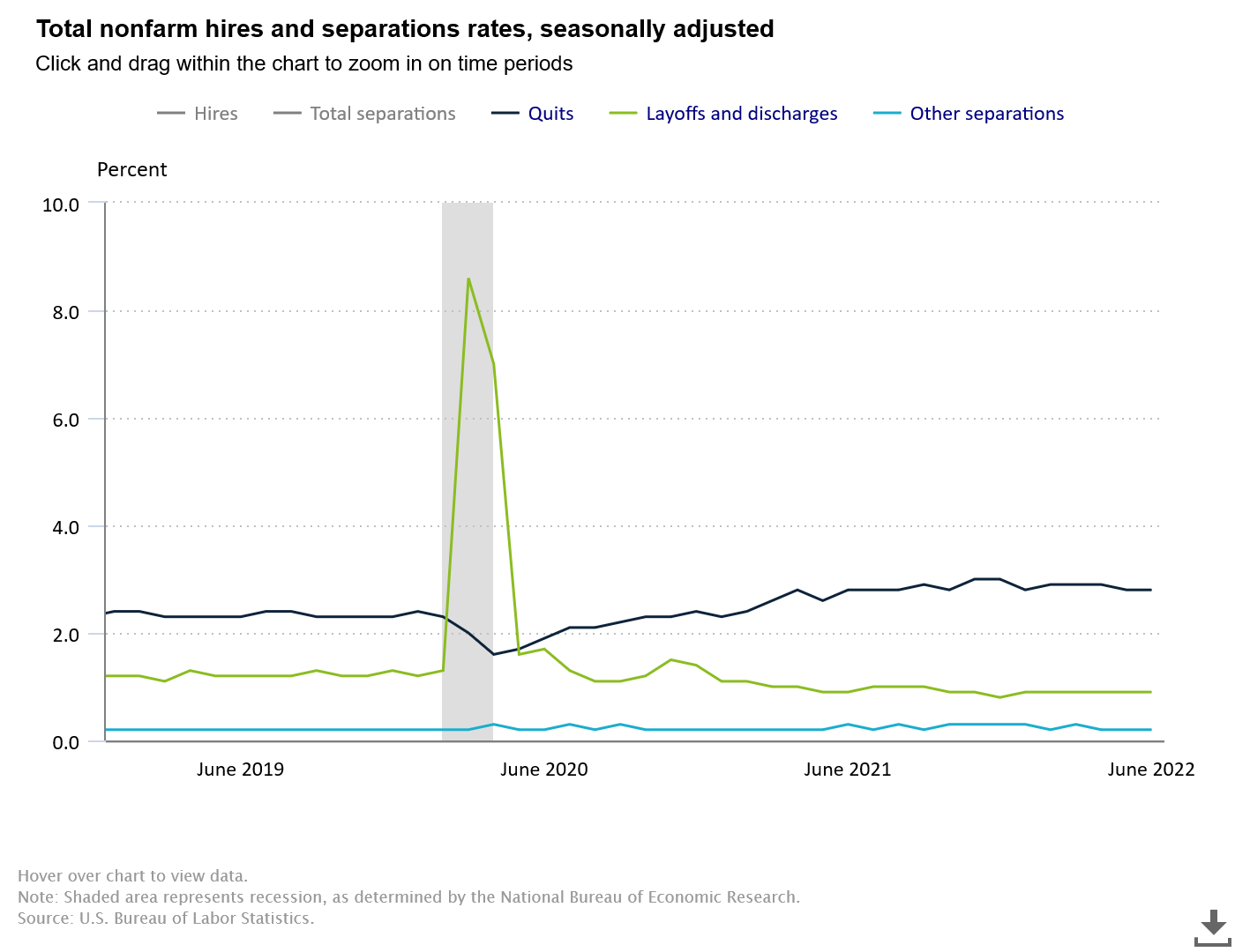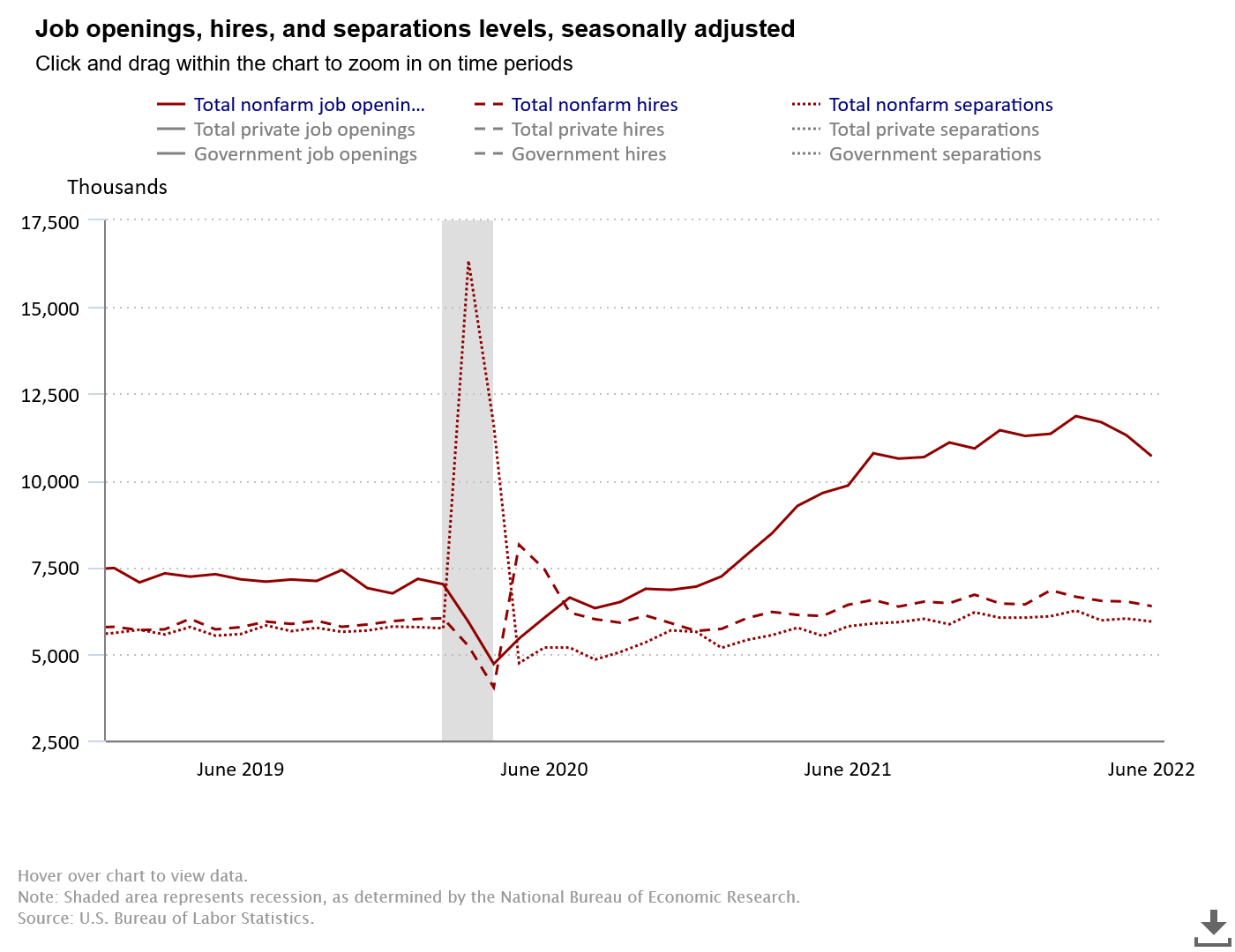 The number of job openings decreased to 10.7 million on the last business day of June, the U.S. Bureau of Labor Statistics reported today. Hires and total separations were little changed at 6.4 million and 5.9 million, respectively. Within separations, quits (4.2 million) and layoffs and discharges (1.3 million) were little changed. This release includes estimates of the number and rate of job openings, hires, and separations for the total nonfarm sector, by industry, and by establishment size class.