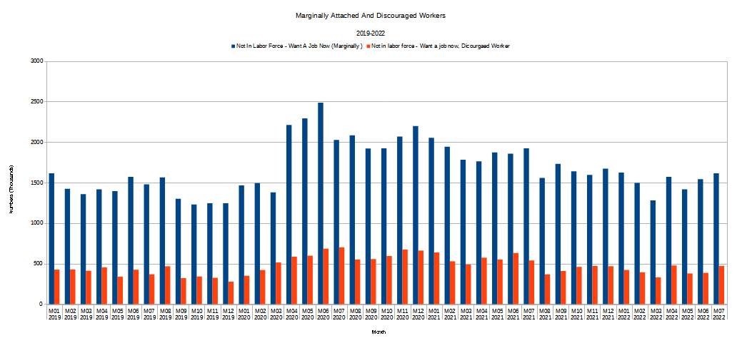 "Marginally attached” means a person is not in the labor force, has looked for a job in the past 12 months, and is available for work at the time of the survey. “Discouraged” are marginally attached workers who believe there is no job available for them.