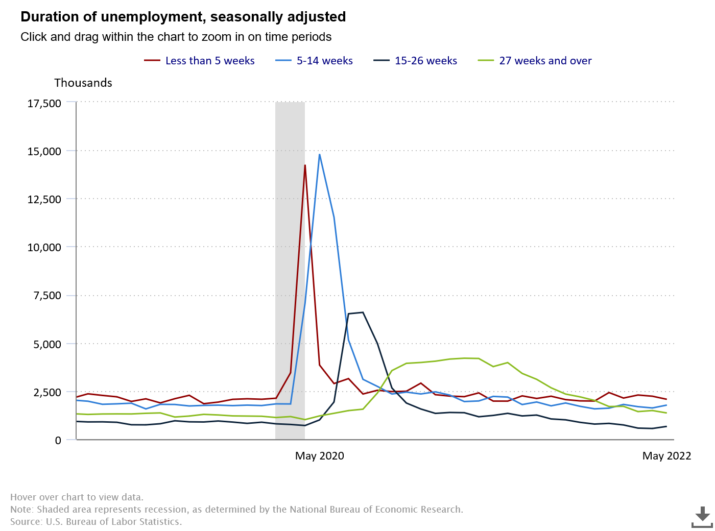 Interestingly, very short term unemployment declined in May, as did very long term unemployment, but unemployment lasting 5-26 weeks actually rose.