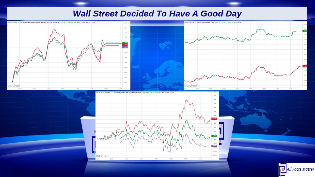(22 April 2025) Stocks, oil, and commodities all finished up on the day’s trading.