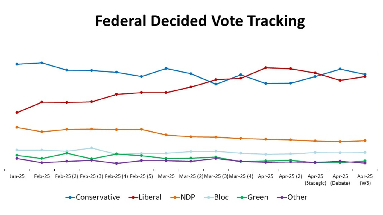Polling firm Innovative Research shows both the Liberals and the Conservatives polling at ~38%-39%,, although the Liberals still have a regional advantage, particularly in Eastern Canada.