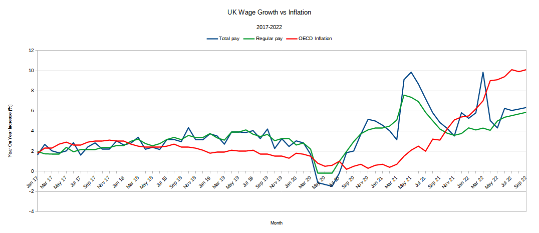 In actual real terms, the negative wage growth is far worse, as the differential between the percentage year-on-year increase in total pay and the inflation rate per the OECD has exceeded 3% since April, and in some months has exceeded 4%,