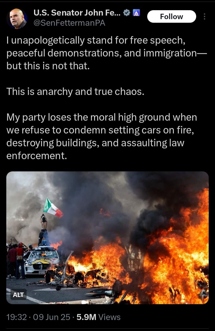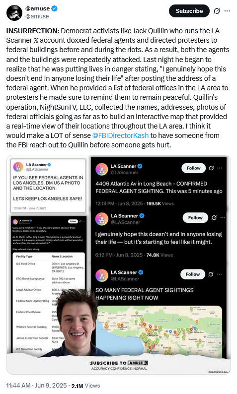Nor should people view this as any sort of grass roots protest movement spun out of control. With online X handles like LAScanner (reported to be one Jack Quillin) having doxxed multiple ICE agents and federal law enforcement officers. there is a clear network of support for those on the front line of this insurreciton.