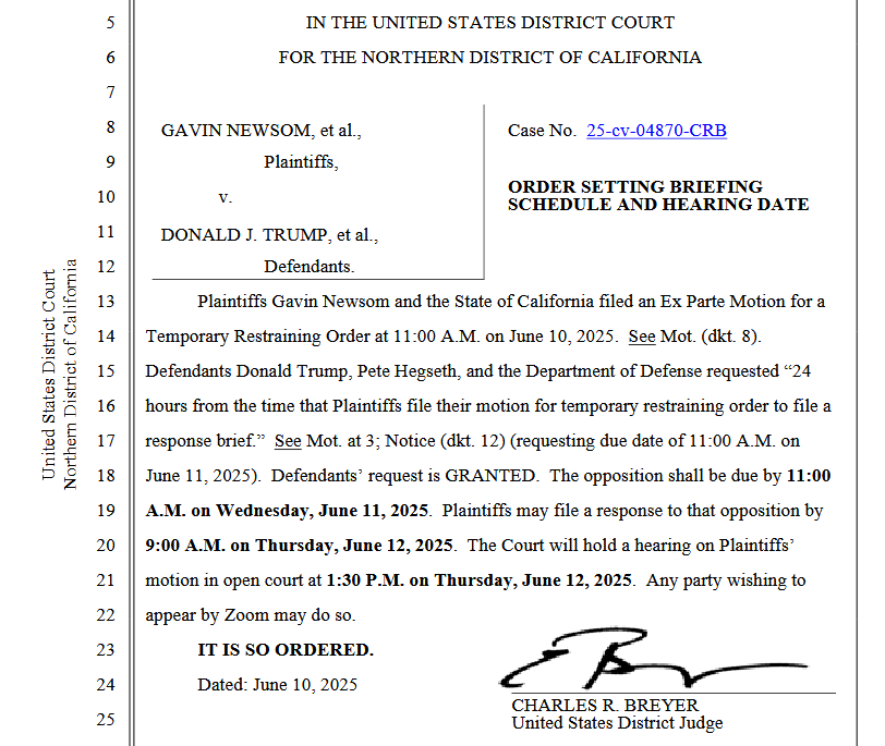 We should hardly be surprised, therefore, that Judge Charles R. Breyer denied Gavin Newsom’s emergency request for a Temporary Restraining Order prohibiting President Trump from deploying National Guard and Marines to assist in quelling the insurrection and restoring order to Los Angeles.