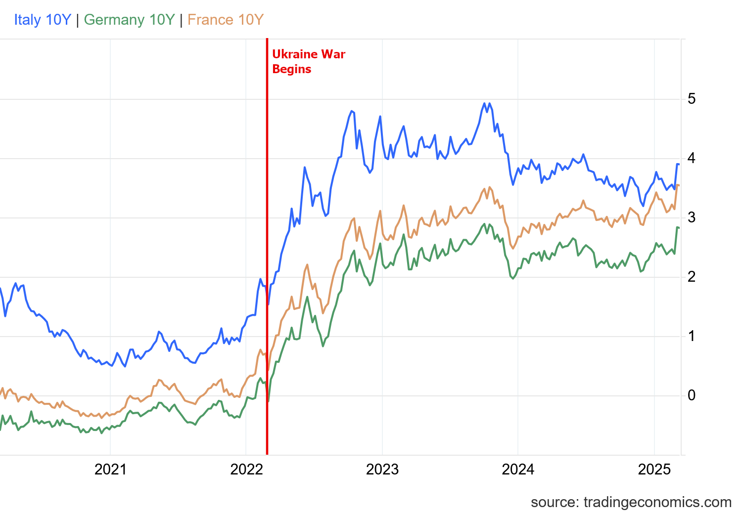 Since the start of the war in Ukraine, interest rates in Germany have moved out of negative territory and climbed very nearly to 3% in the fall of 2023. Recent speculation over the proposed debt-and-spending package being championed by Merz is pushing bund yields close to that level yet again.