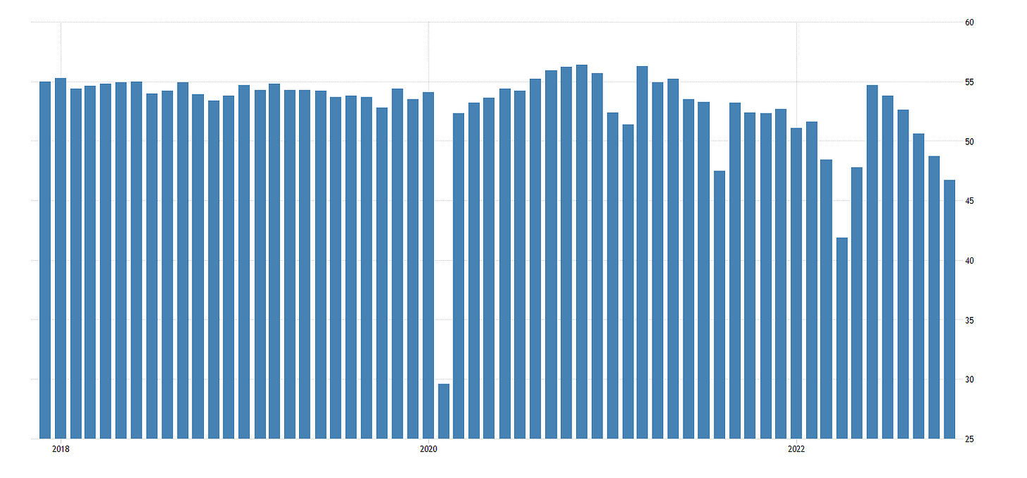 The non-manufacturing index, which measures activity in the construction and services sectors, declined to 46.7 from 48.7 in October, also lower than the consensus estimate of 48. A reading below 50 indicates contraction, while anything above suggests expansion.