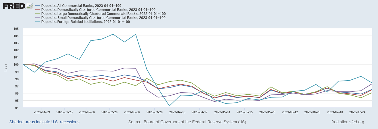 Whether the increase in CRE debt delinquencies will precipitate a fresh banking crisis is still indeterminate. While on the one hand increased debt delinquencies can place liquidity stress on a bank’s remaining assets, for the present at least banks are succeeding in retaining and even increasing customers’ deposits.