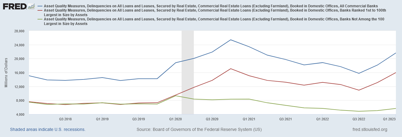 Certainly we are seeing this in the US CRE markets, with delinquency rates on real estate loans rising significantly since the third quarter of last year.