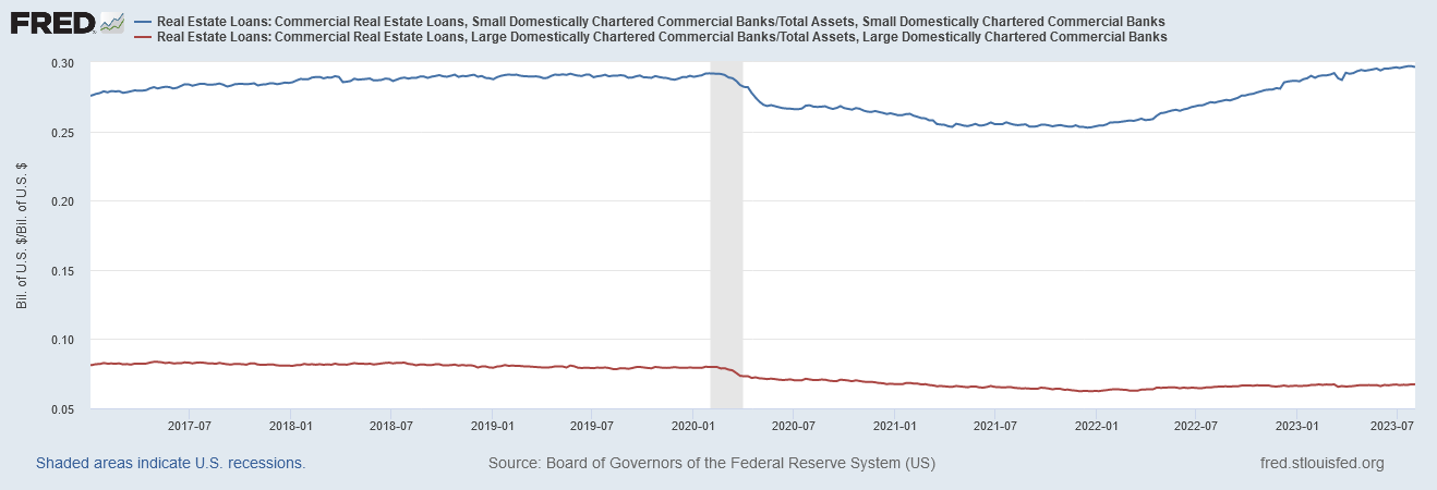 This is happening even as small banks hold a larger percentage of their total assets in commercial real estate loans than larger banks—30% to 7%.
