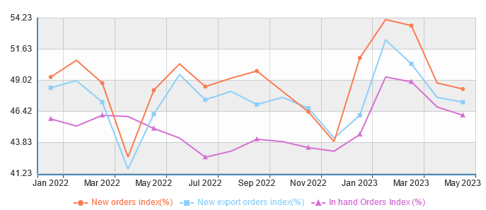 The official manufacturing purchasing managers' index (PMI) was 48.8 from 49.2 in April, according to data from the National Bureau of Statistics (NBS), its lowest in five months and below the 50-point mark that separates expansion from contraction. The PMI also dashed forecasts for an increase to 49.4.
