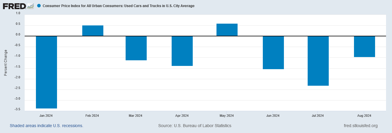 Even used car prices, which are continuing a broad deflationary trend, declined less in August than in earlier months.