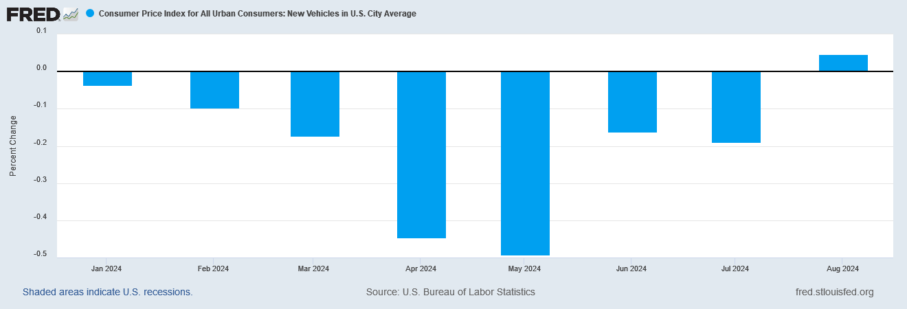 At the same time, prices for goods such as new cars during August went from outright price deflation to moderate price inflation month on month.