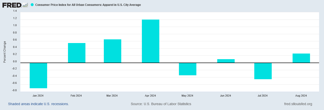 Apparel prices also inched up in August, after having been in outright deflation during previous months.