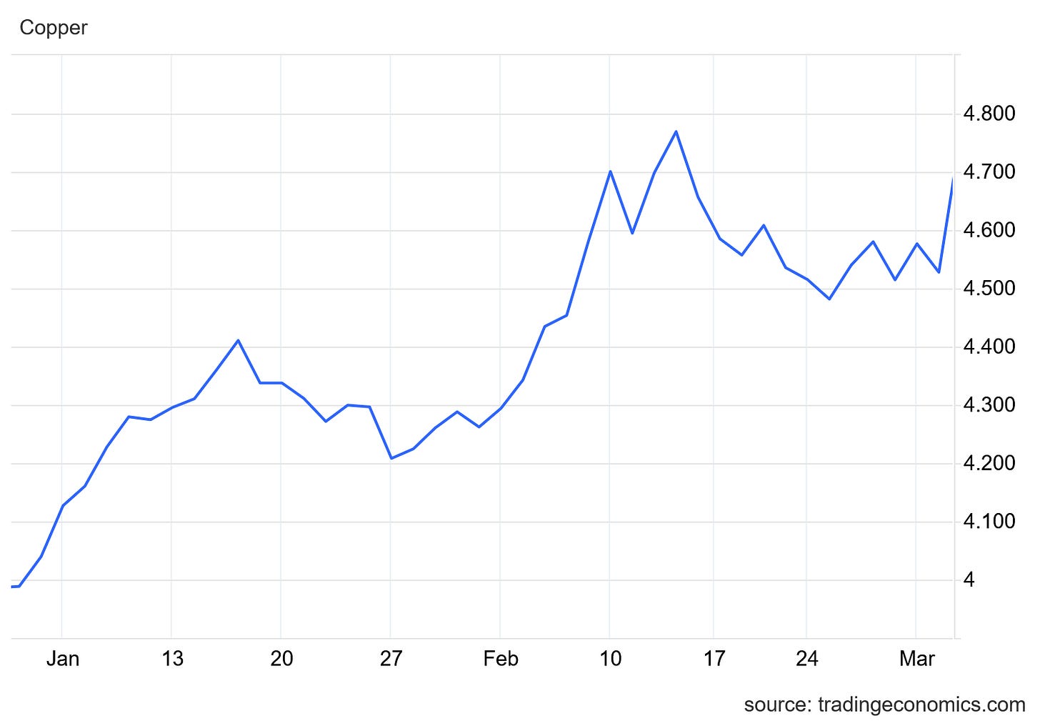 Are Trump’s tariff threats spooking commodities markets the same way they appear to be disturbing equity markets? We certainly cannot rule that out, and as a theoretical proposition uncertainty over tariffs would create uncertainty in final commodity prices, which would in turn push commodity prices downward. Trumpian uncertainty may very well be what we are seeing in the cooler-than-expected inflation print for February.