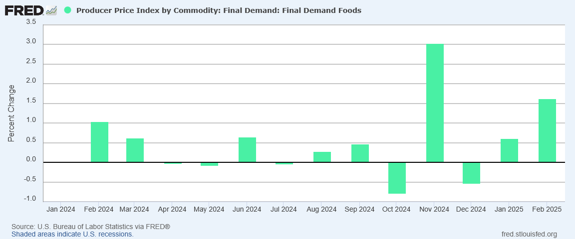 The Producer Price Index for final demand was unchanged in February, seasonally adjusted, the U.S. Bureau of Labor Statistics reported today. Final demand prices rose 0.6 percent in January and 0.5 percent in December 2024. (See table A.) On an unadjusted basis, the index for final demand advanced 3.2 percent for the 12 months ended in February.