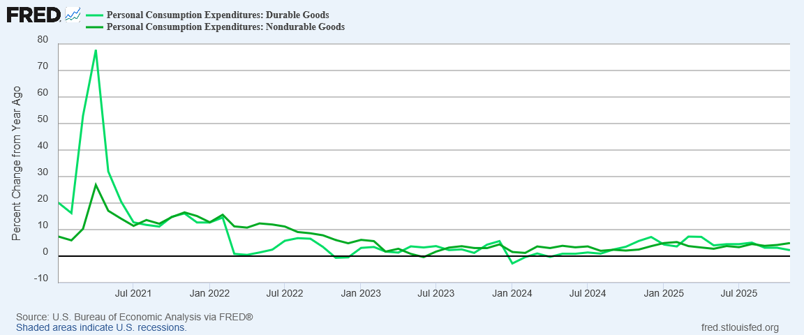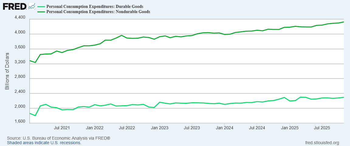 This is notable because consumption expenditures for both durable and nondurable goods have been rising at a steady pace since 2021.