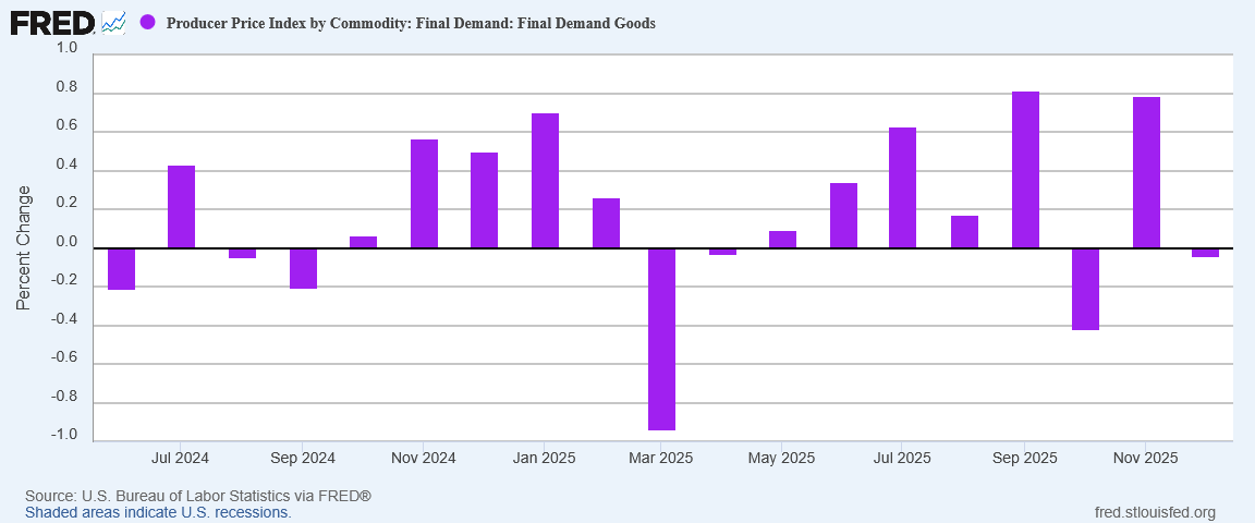 Follow the corporate media rationale: factory gate inflation rose less in 2025 than in 2024, but tariffs were the cause of that reduced inflation in 2025. Also, tariffs cause prices for final demand goods to remain unchanged in December.
