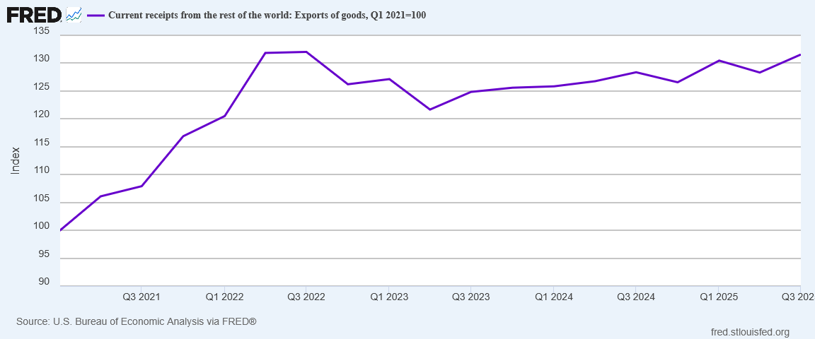 Tariffs are certainly not dissuading countries from buying US products. Given the trade war dimensions of the “muh tariffs” narrative, if tariffs were having dramatic impact on trade overall we certainly should not be seeing rising export receipts—yet we are.