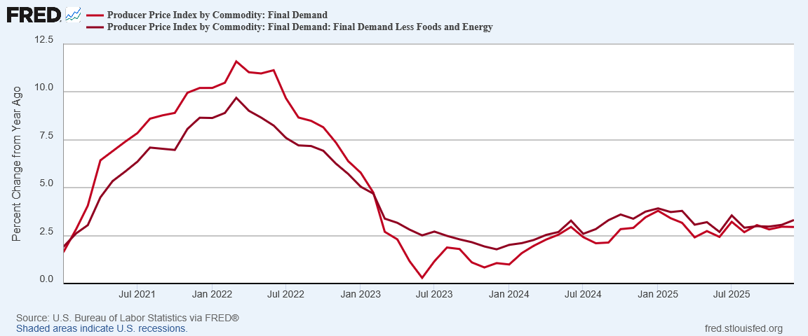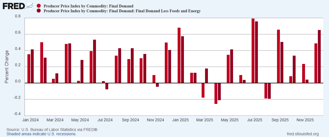 The Producer Price Index for final demand increased 0.5 percent in December, seasonally adjusted, the U.S. Bureau of Labor Statistics reported today. Final demand prices advanced 0.2 percent in November and 0.1 percent in October. (See table A.) On an unadjusted basis, the index for final demand rose 3.0 percent in 2025 after moving up 3.5 percent in 2024.