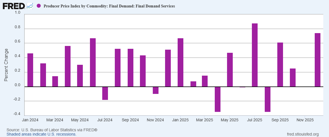 As even the BLS noted, by far the largest contributor to December’s increase in core PPI was the services category—and the Liberation Day tariffs were not levied on services (remember, tariffs are levied against goods).
