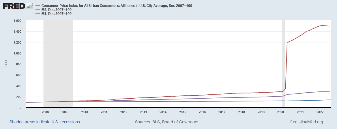 Moreover, if we index the Consumer Price Index, the M1 money supply, and the M2 money supply to the onset of the 2007-2009 recession, to view simply the magnitude of changes in each, we do not see any corresponding shifts in the CPI to match the 2020 increase in the M1.