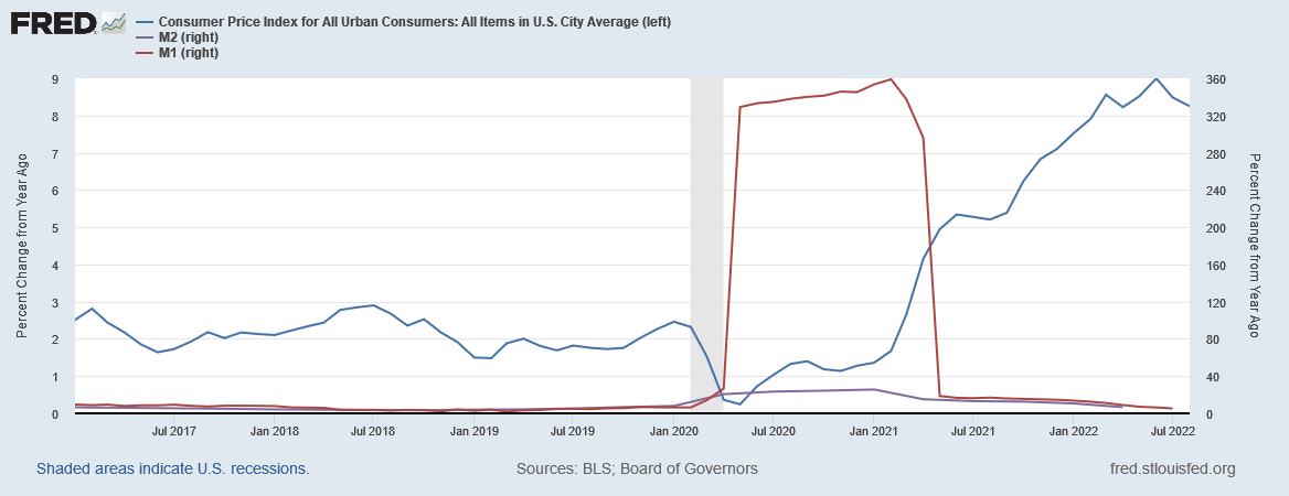 This is further reiterated by the lack of clear correlation between the growth of the money supply and the rise of inflation. While the Fed greatly expanded the M1 money supply in early 2020, inflation did not show up at a meaningful level until the following year, and kept rising even as the rate of money supply growth returned to prior historical levels.