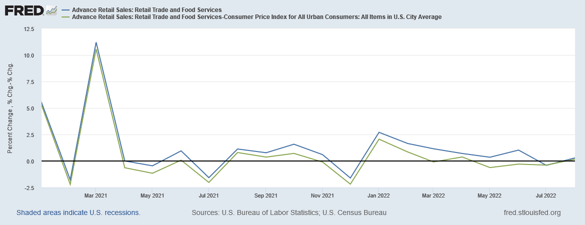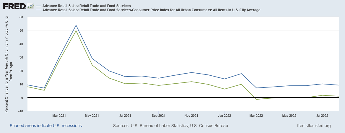 While their key facts on retail sales are notionally true, the failure to include the impact of ongoing inflation is an egregious omission. If one subtracts out inflation, retail sales have seen approximately zero year on year growth since March of this year, as inflation has taken a larger and larger bite of inflation out of the retail sales figure.