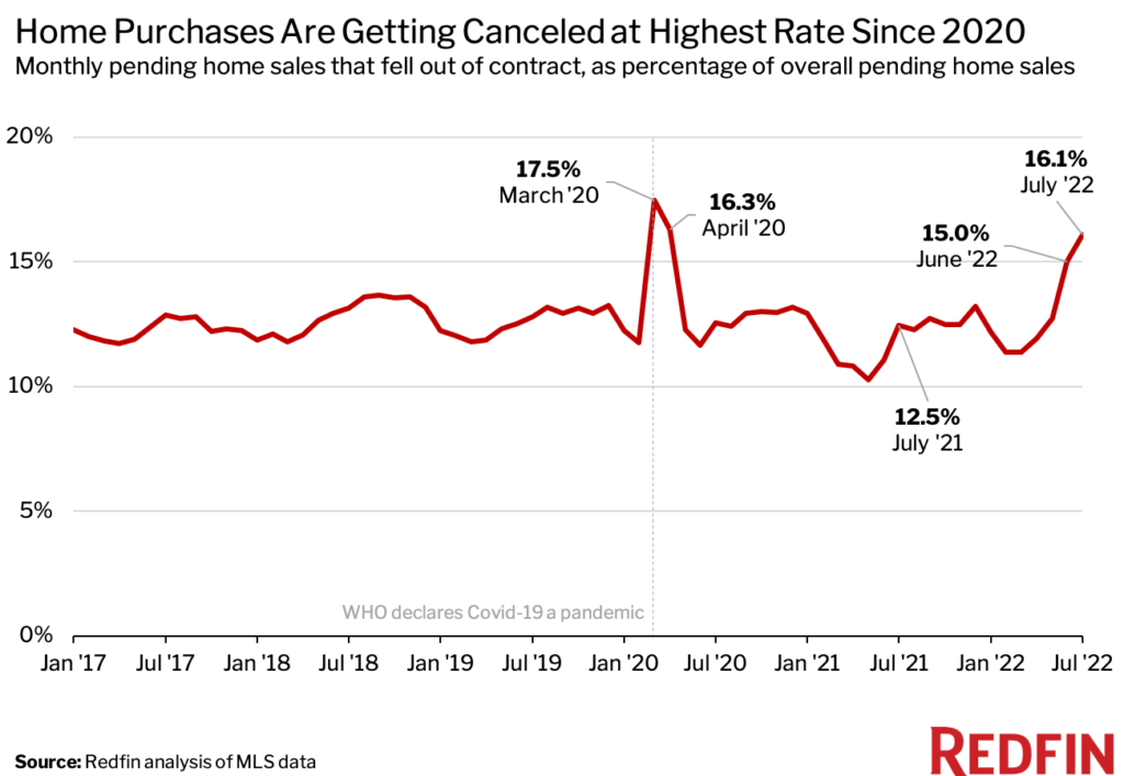 Nationwide, roughly 63,000 home-purchase agreements fell through in July, equal to 16.1% of homes that went under contract that month. That’s the highest percentage on record with the exception of March and April 2020, when the onset of the coronavirus pandemic brought the housing market to a near standstill. It’s up from a revised rate of 15% one month earlier and 12.5% one year earlier.