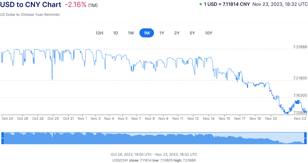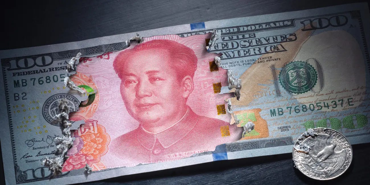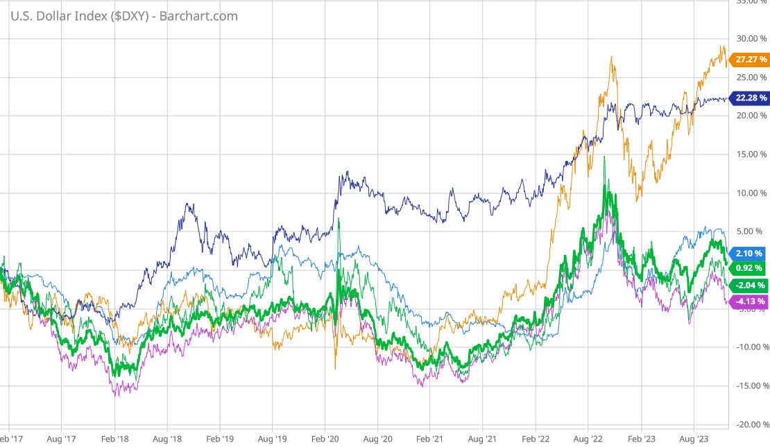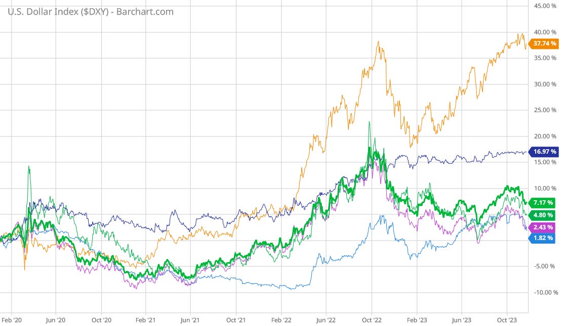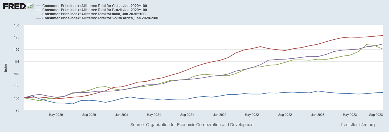 Even for China, which has had a fairly paltry 2% increase in consumer prices since 2020, the increase in the value of the dollar against the yuan comes in at a little over half that over the same time frame.