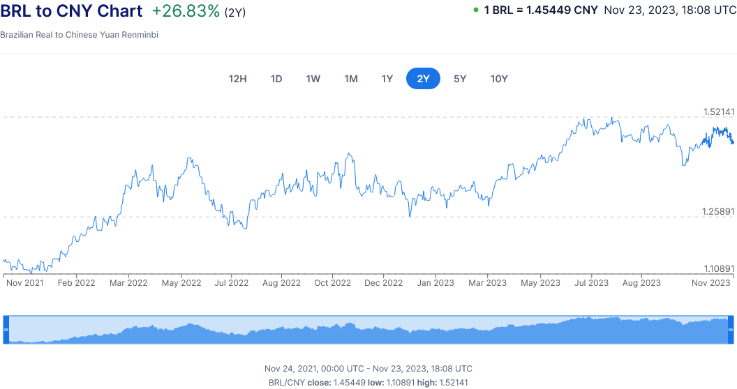 In other words, a Brazilian Real today buys 26% more value in Chinese goods and services than two years ago.