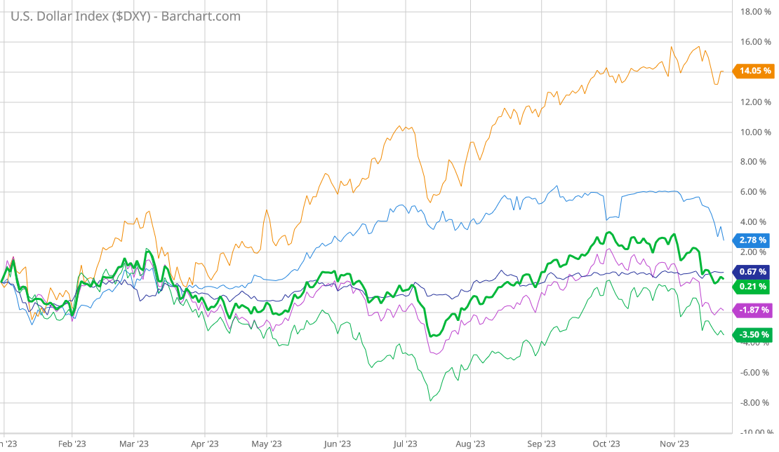 That performance becomes significantly weaker if we come forward again to the beginning of 2023, with the euro and the British pound again gaining more ground than the dollar index itself.