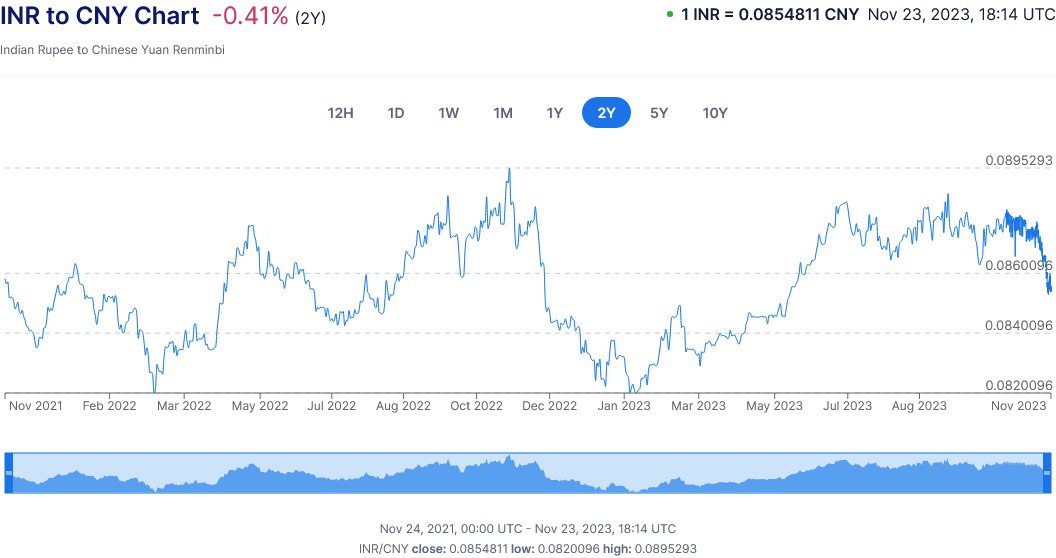 Yet over the same time frame the Indian Rupee has actually lost 0.41% of its purchasing power vis-a-vis the Yuan.