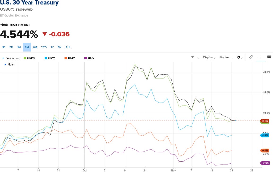 "After all, US bond yields across the curve had been steadily rising and putting pressure on these currencies for much of this year. (Meanwhile, bond yields in Japan and China have not kept pace with the US, either on the way up or the way down)," he wrote. "So, it isn't surprising to us that these currencies have rallied amid the fall in US yields since mid-October." (See chart below).