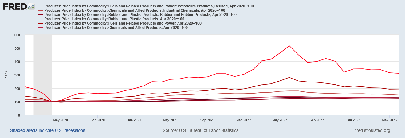 Unsurprisingly, chemicals, rubber, and plastic again follow the energy curve—crude oil is relevant throughout the manufacture of these goods, so the correlation should be self-evident, and it is.