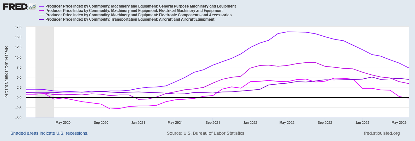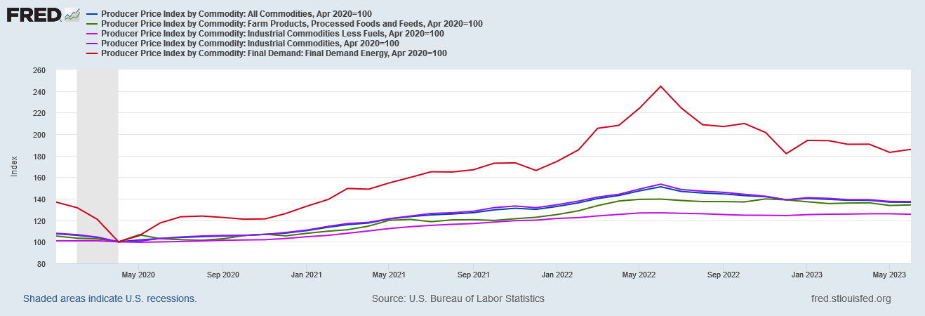 When we begin looking at PPI for various commodity categories, we once again see either a plateau or a decline.